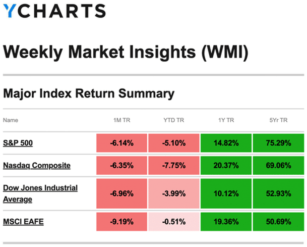 The Standard & Poor’s 500 Index lost 2.12 percent, while the Nasdaq Composite Index fell 3.23 percent. The Dow Jones Industrial Average slid 0.90 percent. The MSCI EAFE Index, which tracks developed overseas stock markets, ended the week flat (-0.05 percent).1,2