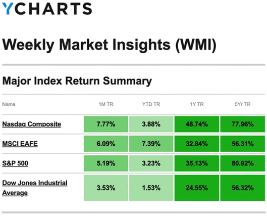 The Standard & Poor’s 500 Index rose 4.54 percent, while the Nasdaq Composite Index picked up 6.84 percent. The Dow Jones Industrial Average advanced 3.19 percent. The MSCI EAFE Index, which tracks developed overseas stock markets, increased 2.15 percent.1,2