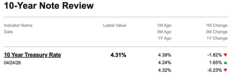 Source: YCharts.com, April 25, 2026. Weekly performance is measured from Monday, April 20 to Friday, April 24. TR = total
